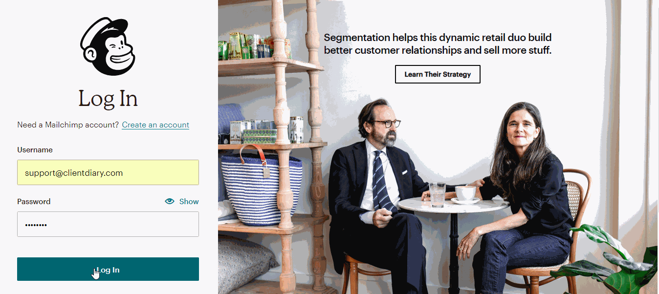 - Log in with your Mailchimp username and password