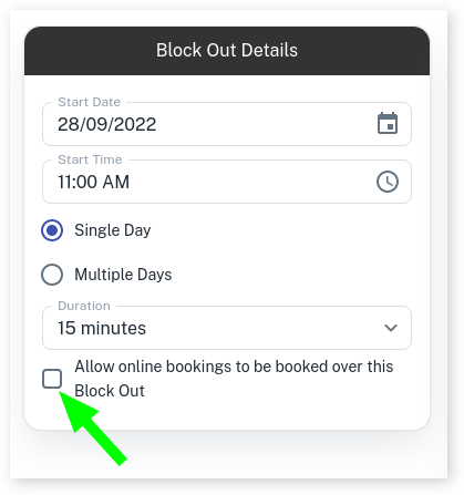- Tick the option to Allow online bookings to be booked over this Block Out