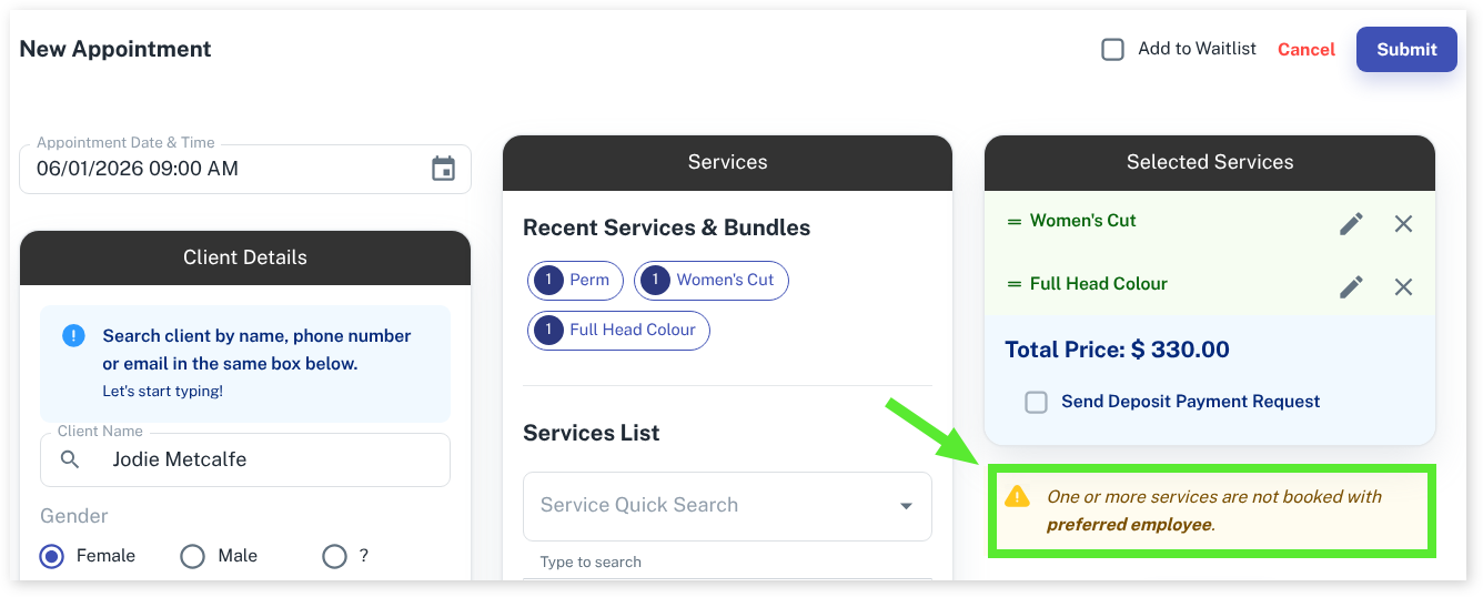 The image below shows you a warning when you try and book a client with another employee that is not their preferred employee.