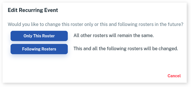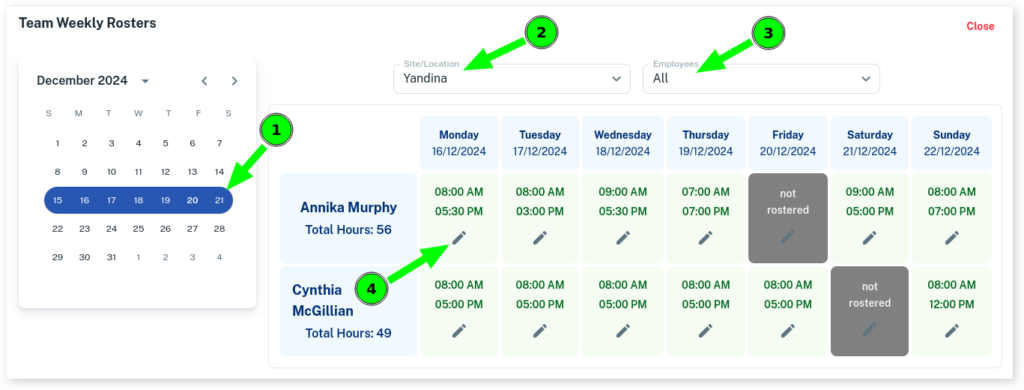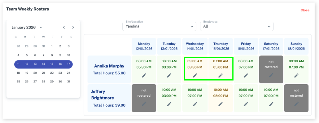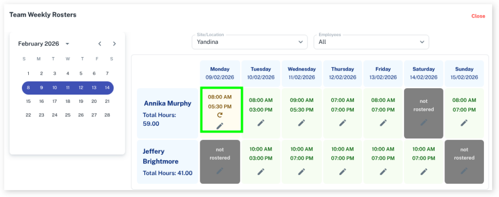 - You can edit rosters by clicking on the edit icon (pencil) on each date
