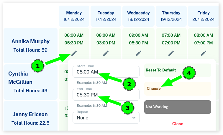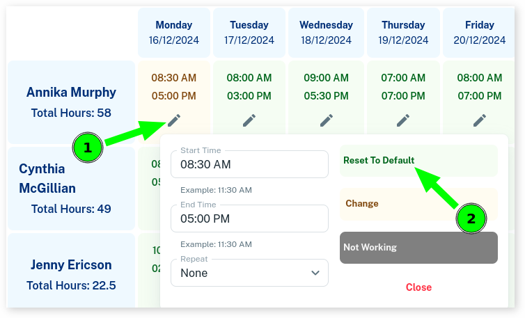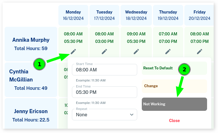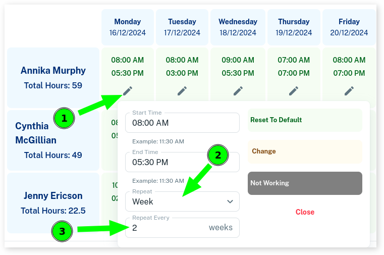 In the example below, I am editing Annika’s roster to be working the set hours every 2nd Monday.