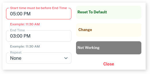When editing the Team Weekly Roster and the finish time is before the end time, the system will give you a warning to let you know you have entered in an incorrect time