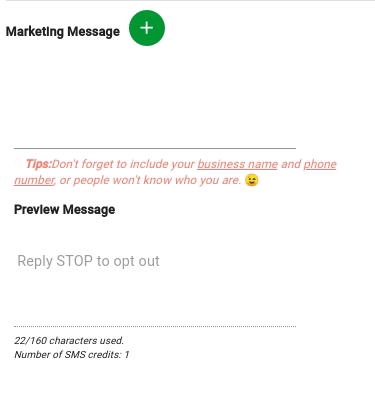 - Personalise the message. You can enter a personalised first name for example by pressing the Green + button next to the Marketing Message title then selecting the data to insert. The image below shows this.