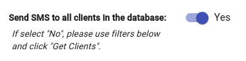 A quick option to send to all clients without editing the selection can be done by pressing the toggle to “Send SMS to all clients in the database“, or edit the selection continue to the next heading.