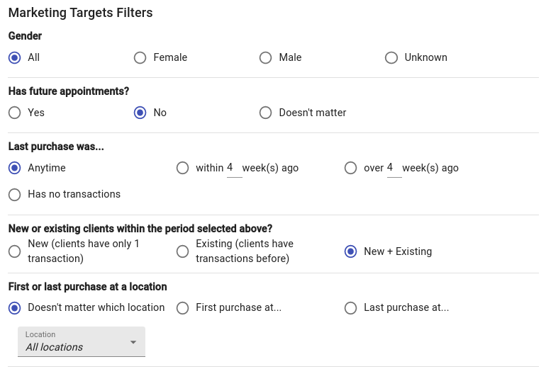 Attention: Before sending any marketing be sure to merge any duplicate clients you may have in the database. This stops clients from receiving messages twice by accident.Documentation on this is here.