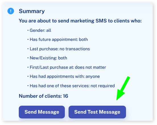 If you wish you can test the message before sending to all your clients. This is good practice to ensure your personalised text come through as expected and it allows you to see it on the client’s screen.