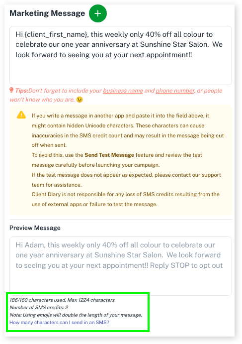 - Enter your message. Note the length of the message in the preview area titled Number of SMS. A single length message uses 1 credit. A double length message uses 2 credits. The goal is usually to try your best to keep the text 1 message in length. The below image shows when it’s 2 messages in length.