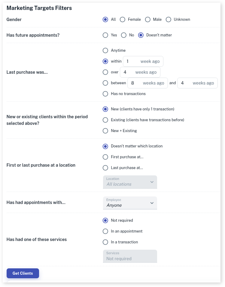 Attention: Before sending any marketing be sure to merge any duplicate clients you may have in the database. This stops clients from receiving messages twice by accident.Documentation on this is here.