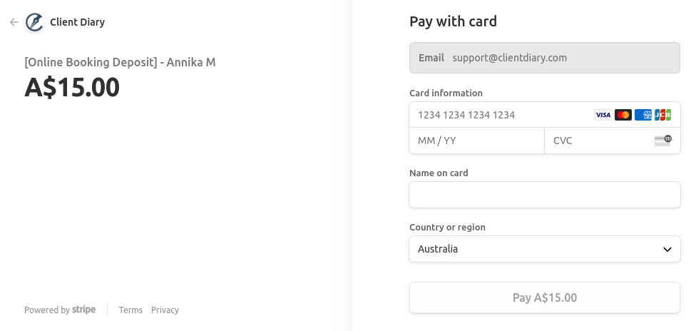 When your clients make a booking and are required to pre-pay, they will be presented to make payment before finalising the booking. The image below shows an example of what that will look like. Note if you have added your logo it will have your business name and branding.