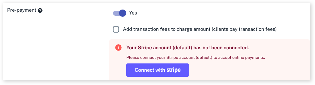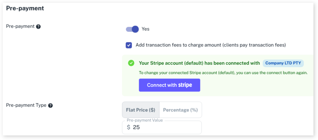 - Scroll down to the Pre-payment area and you will see there are now more options and a message stating “Your Stripe account has been connected”