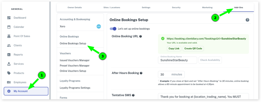 - Click on Online Bookings Setup