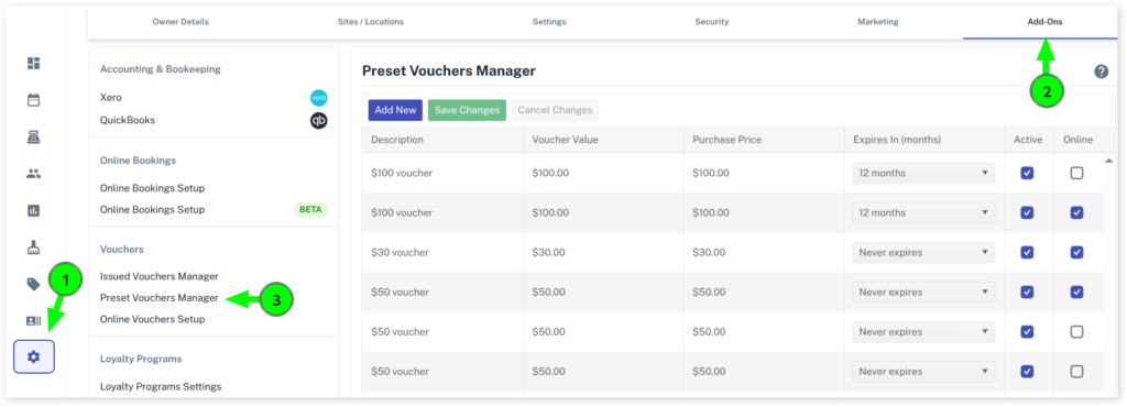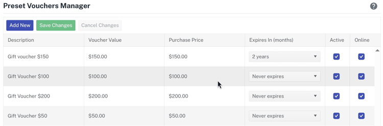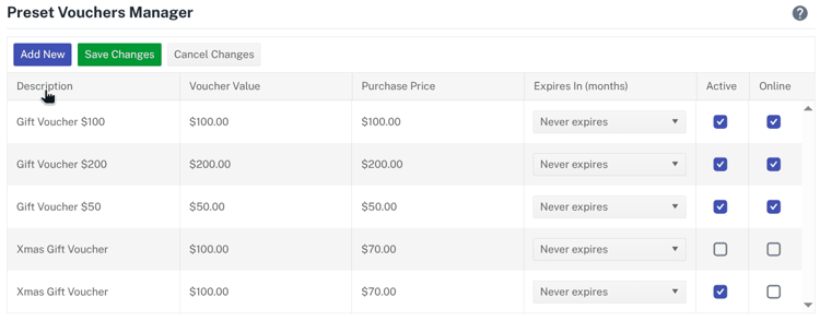 NOTE: If a voucher is not active, it can no longer be sold via the online vouchers tool even if the online check box is still ticked.