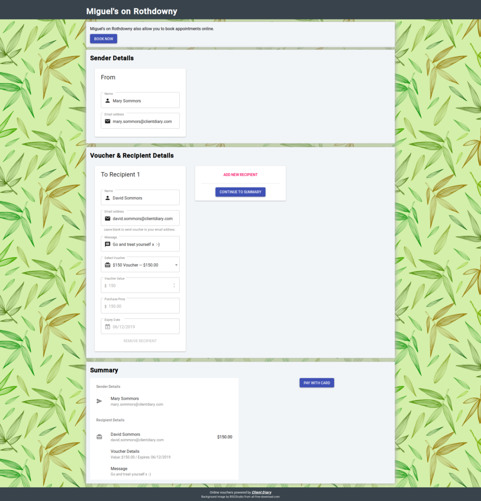 The image below shows how a user can simply add multiple voucher recipients. This is particularly useful for purchasing for a family, a group of friends or as a corporate / business group buy.