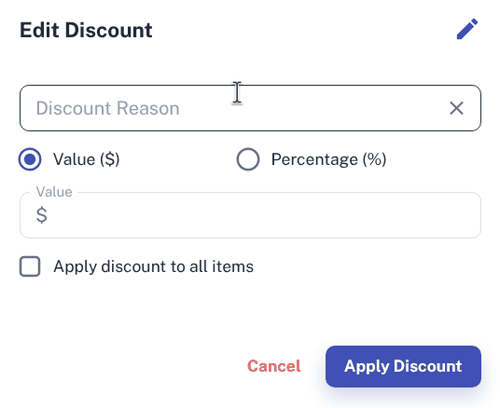 - Give the discount a name in the Discount Reason input area