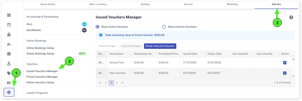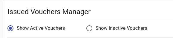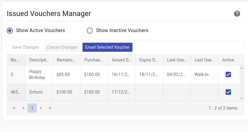 - To change a voucher from active to inactive or from inactive to active, simply tick or untick the Active Checkbox and press the Save Changes button.