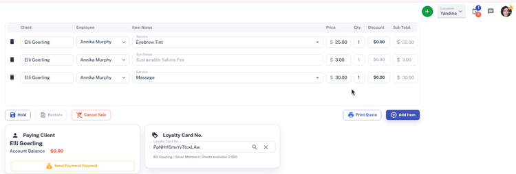 When your client pays for their Services, the Sustainable Salons Fee will automatically be applied. As you can see in this example, a client’s bill is taken to POS and the Sustainable Salons Fee automatically appears.