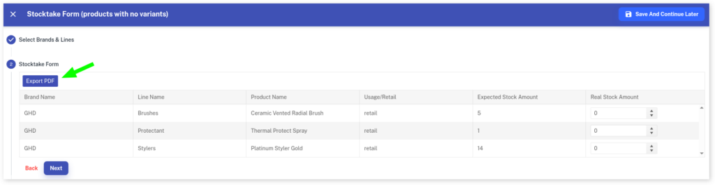 - Now it will have in a list Brand Name, Line Name, Product Name, Usage/Retail, Expected Stock Amount and Real Stock Amount