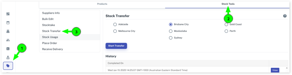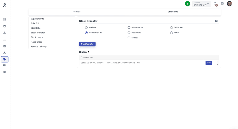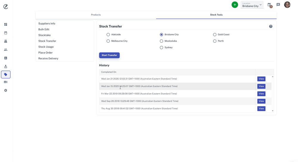You can view previous stock transfers that have been done by clicking on the View button on the right under the History heading.