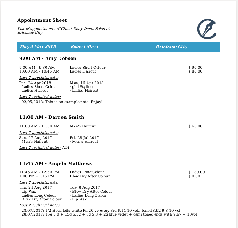 Client Diary allows you to easily print out your upcoming appointments. This special report allows you to choose specific staff or all staff and when printed it shows: