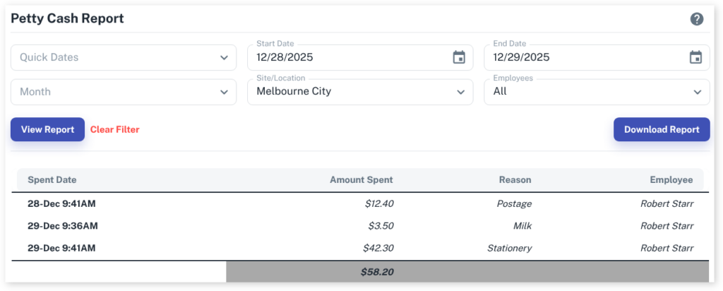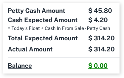 Important : The petty cash is taken from the float in the calculations. So if you had say a $50 float, had no cash income that day and spent $45.80 in petty cash, your float balance would be $4.20 at the end of the day.