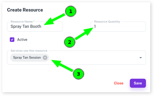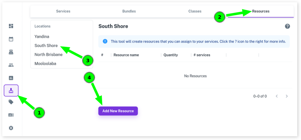 Learn how to set up Service Resources for tracking limited business resources and preventing crossover by selecting Services, Resources, choosing a Site/Location, adding a new resource with a name and quantity, assigning services, and saving, with further details in the Service Resources Overview.