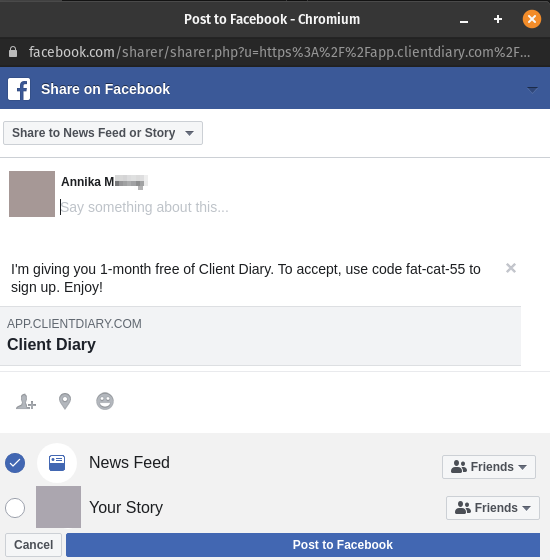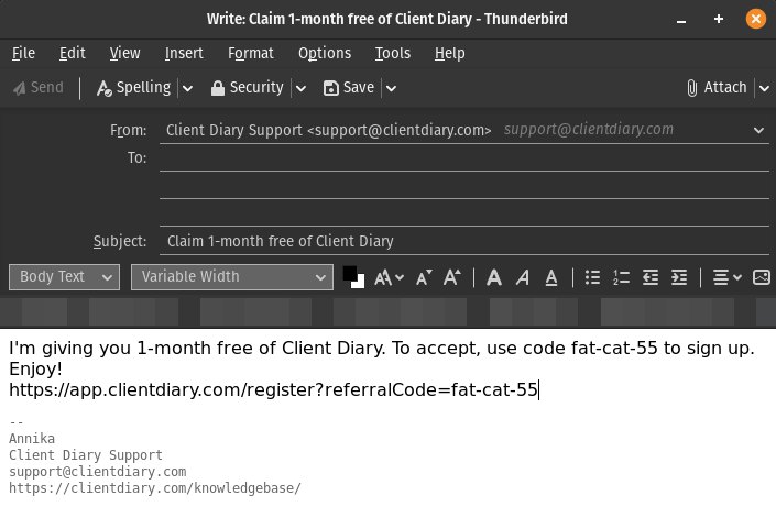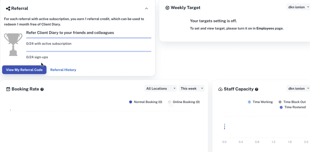 When you refer someone and they use your referral code, as a thank you, yourself and the person you refer will receive one month of Client Diary completely free.