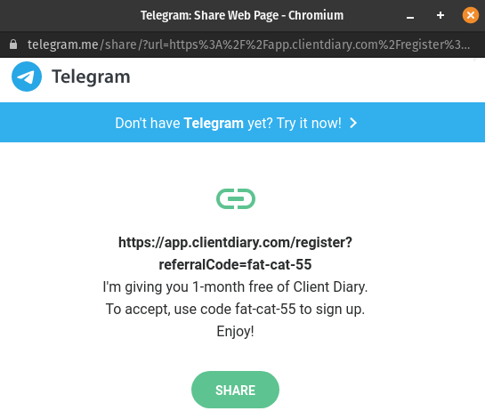 The telegram button will open in another window where you can copy and past the link provided into your telegram to share with anyone. It will also prompt to open Telegram and to send it directly to a contact.