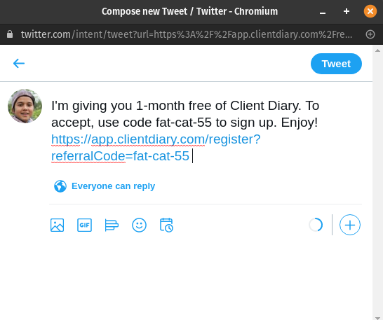 Using the Twitter button will open a new window where you can send a tweet using the custom referral link.