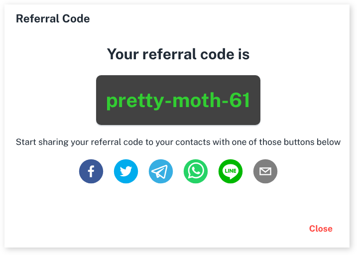When the code has been created or when pressing View My Referral Code, you will receive the options to share the code or link on different social media platforms.